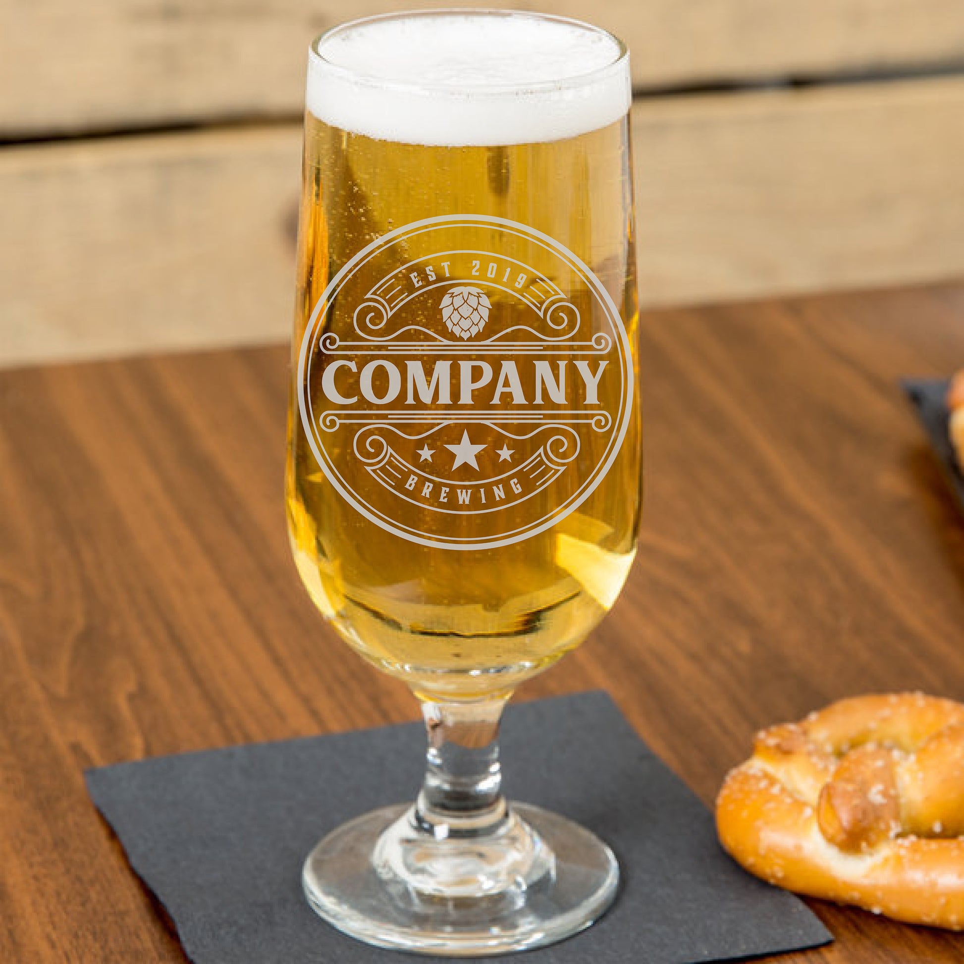 Serve your finest ale in this classy Libbey Embassy stemmed pilsner glass, personalized with your bar, restaurant, event, or venue logo! This footed glass features a sturdy stem to elevate any beer on your menu to a higher level of sophistication. Boasting crystal-clear clarity and a tall, slender silhouette, this glass showcases a freshly poured lager or ale for an elegant flair to any patron's beer-drinking experience. Designed with a narrow rim to trap and hold foam, the aromas and flavors are directed right to the top. Your beer-loving patrons will appreciate the fulfilling experience provided by this elegant engraved glass. Plus, the chip-resistant rim and foot add durability for long-lasting use. Perfectly balanced to rest on trays, tabletops, and counters allow you to serve with confidence.